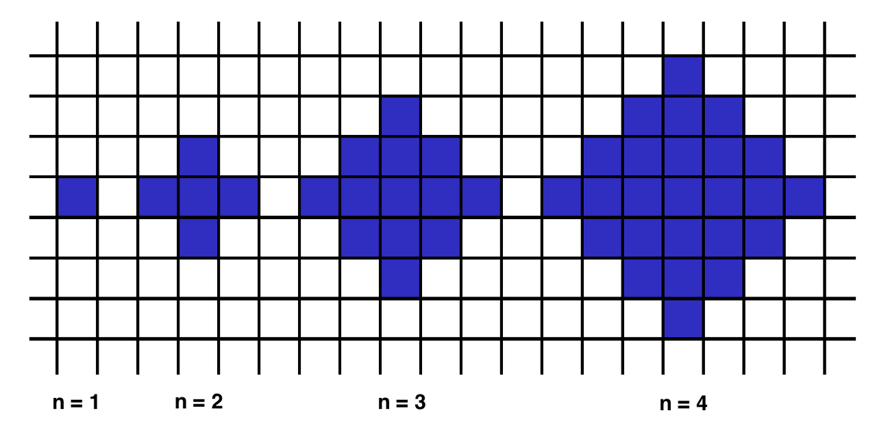 A 1-interesting polygon is just a square with a side of length 1. An n-interesting polygon is obtained by taking the n - 1-interesting polygon and appending 1-interesting polygons to its rim, side by side. You can see the 1-, 2-, 3- and 4-interesting polygons in the picture below.